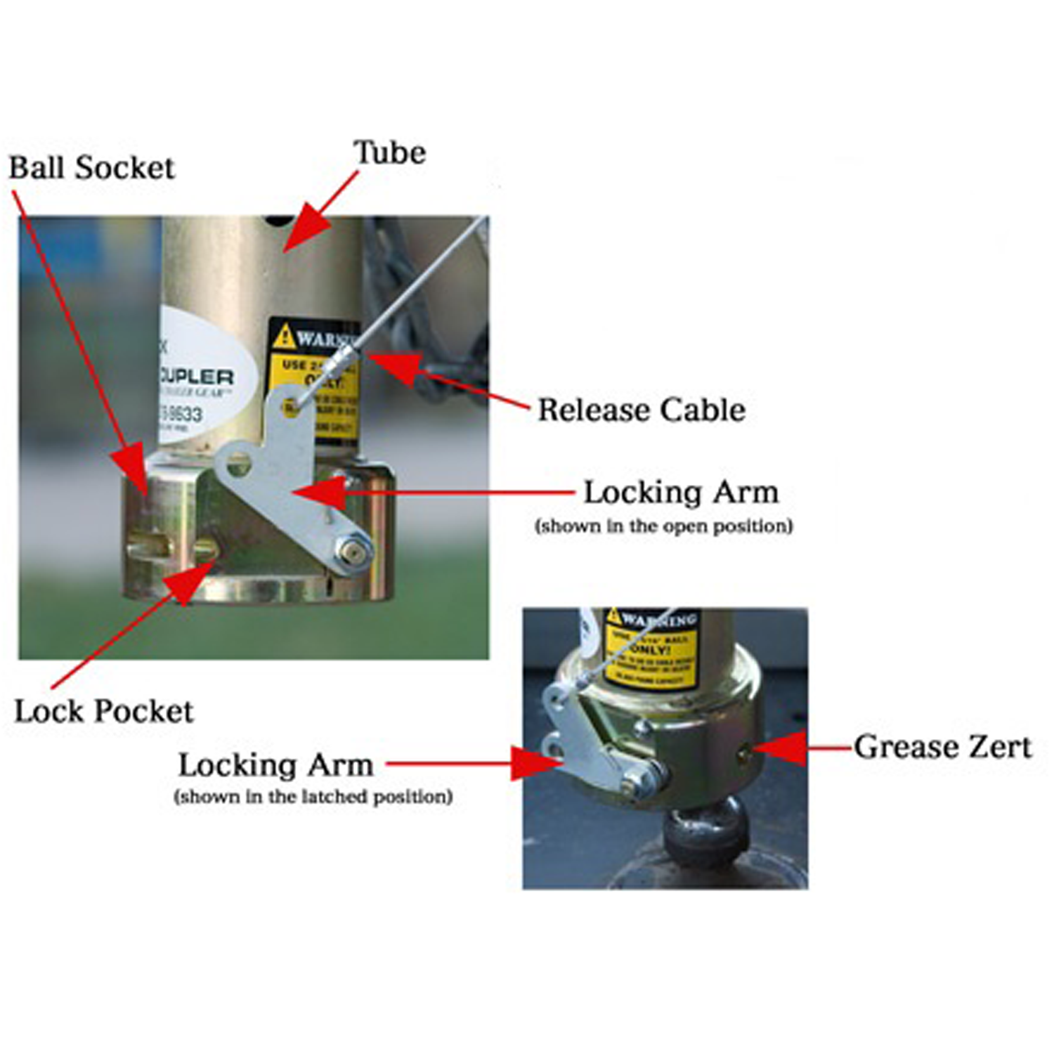 Attention: ONLY install the coupler onto a gooseneck trailer receiver tube designed for 4″ round or 4″ or 4.5″ square adjustable coupler. ONLY use the Quick Coupler with a 2 5/16 ball. Use of safety chains is always recommended.
